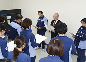 朝礼にて従業員全員で作業の進捗を報告・共有します。短期間で高品質なものづくりの実現のために、従業員全員が進捗を把握できる場を設けています。
