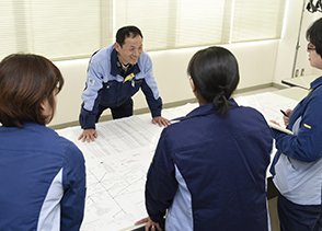 図面を確認しながら、問題点や疑問点がないかを確認します。全従業員が高品質な製品づくりに携われるよう、疑問点などはベテランの方に相談し、作業を行います。実践を通して、技術を伝えることも品質管理を行う上では重要なことです。